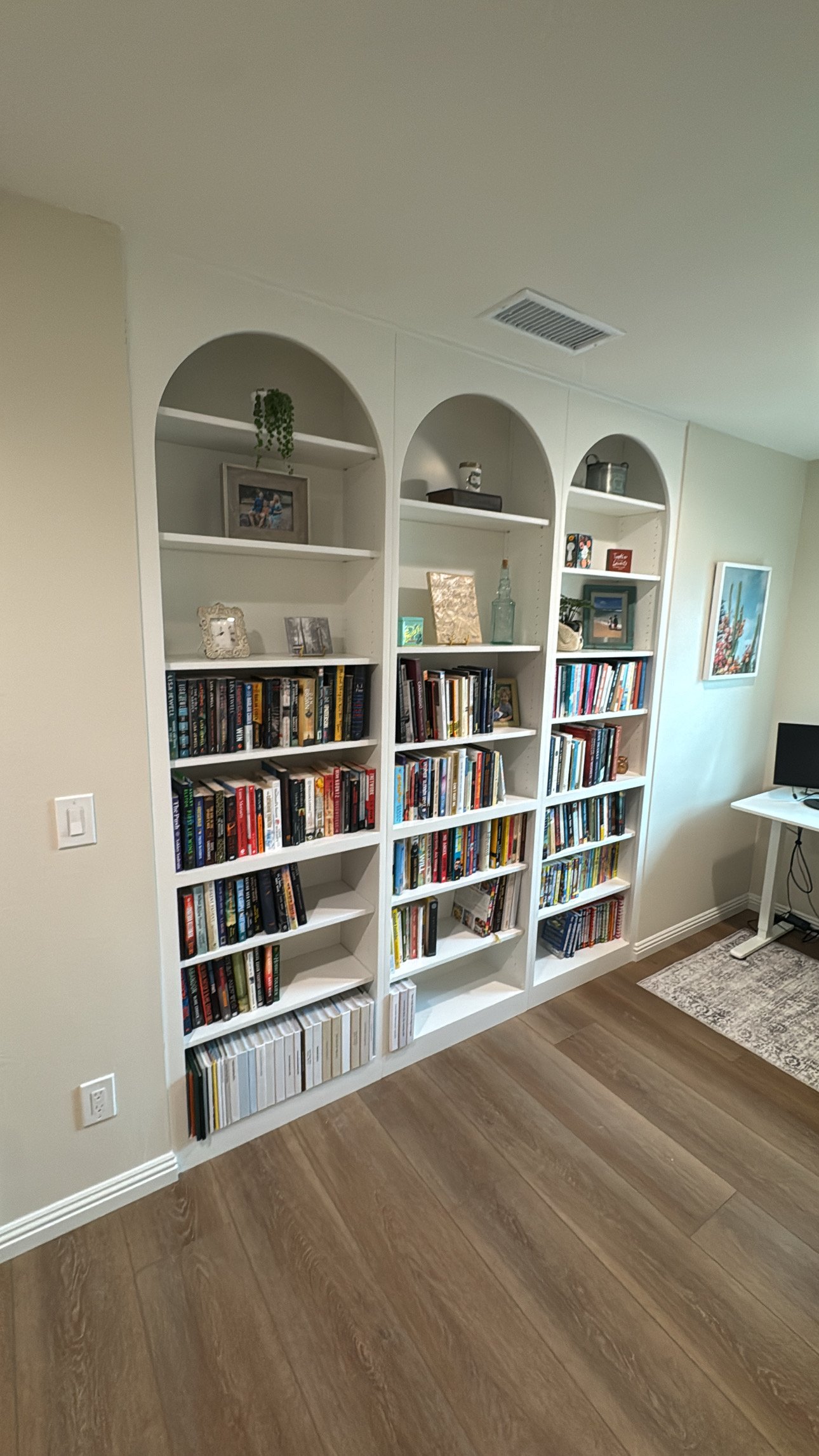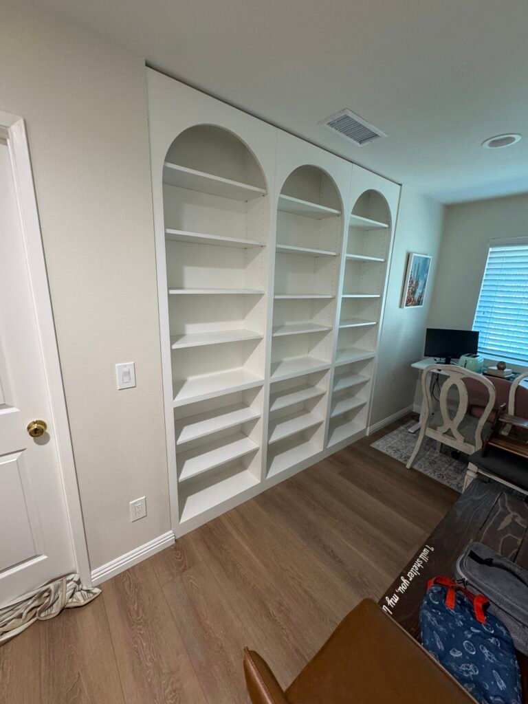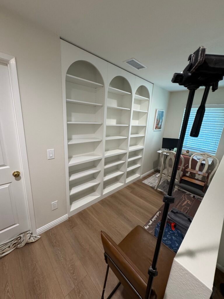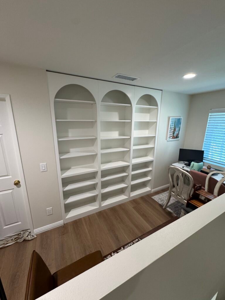 The owner of this beautiful Carmel Valley home wanted to transform a blank wall in their upstairs loft into a truly special home library and study. They envisioned a built-in that went beyond simple, straight shelving—they desired a piece with timeless character, architectural grace, and a touch of classic elegance. Our team was commissioned to design, build, and install a stunning, floor-to-ceiling library wall, featuring three magnificent, custom-crafted arches that elevate the bookshelf into a sophisticated work of art.