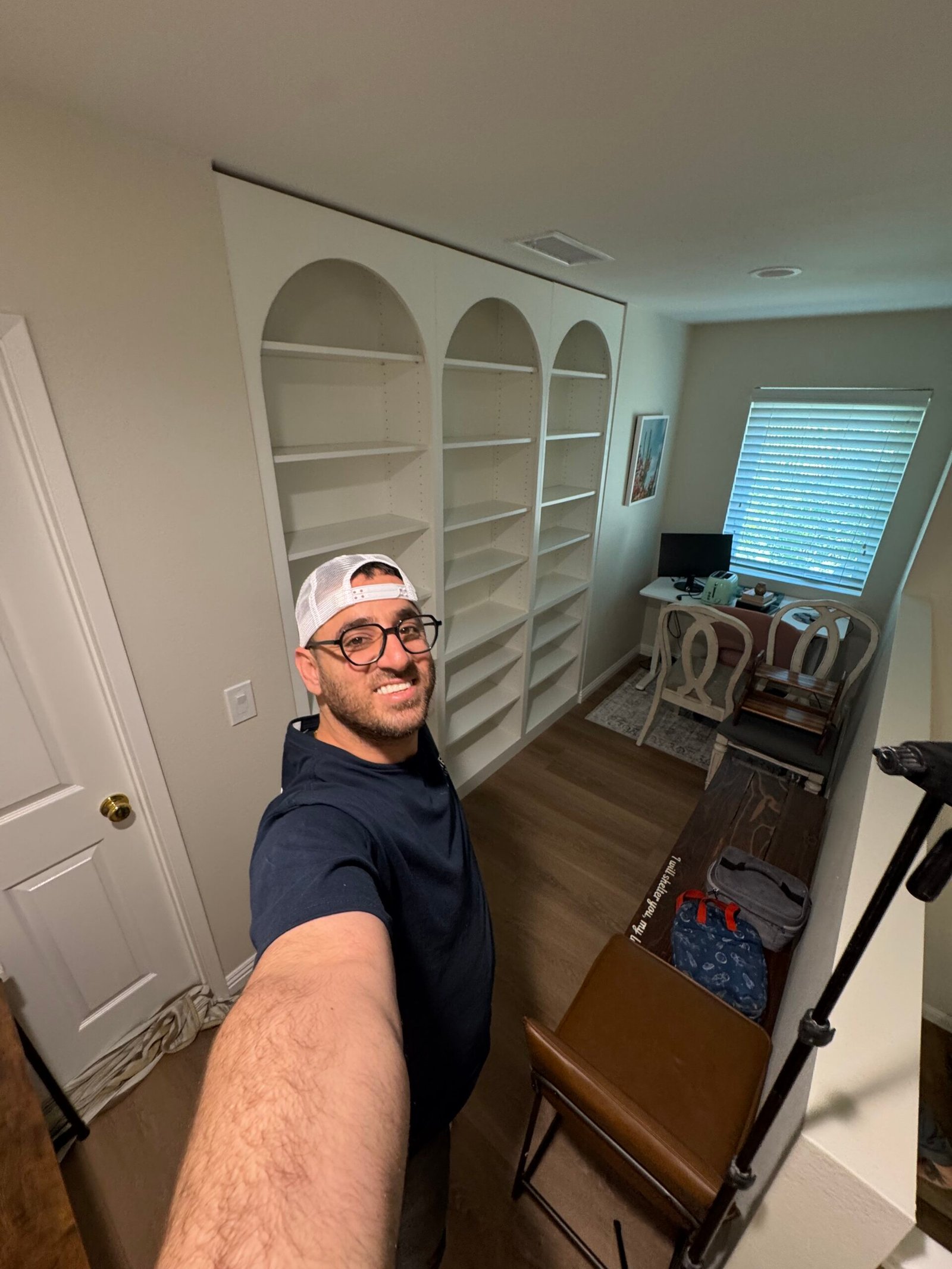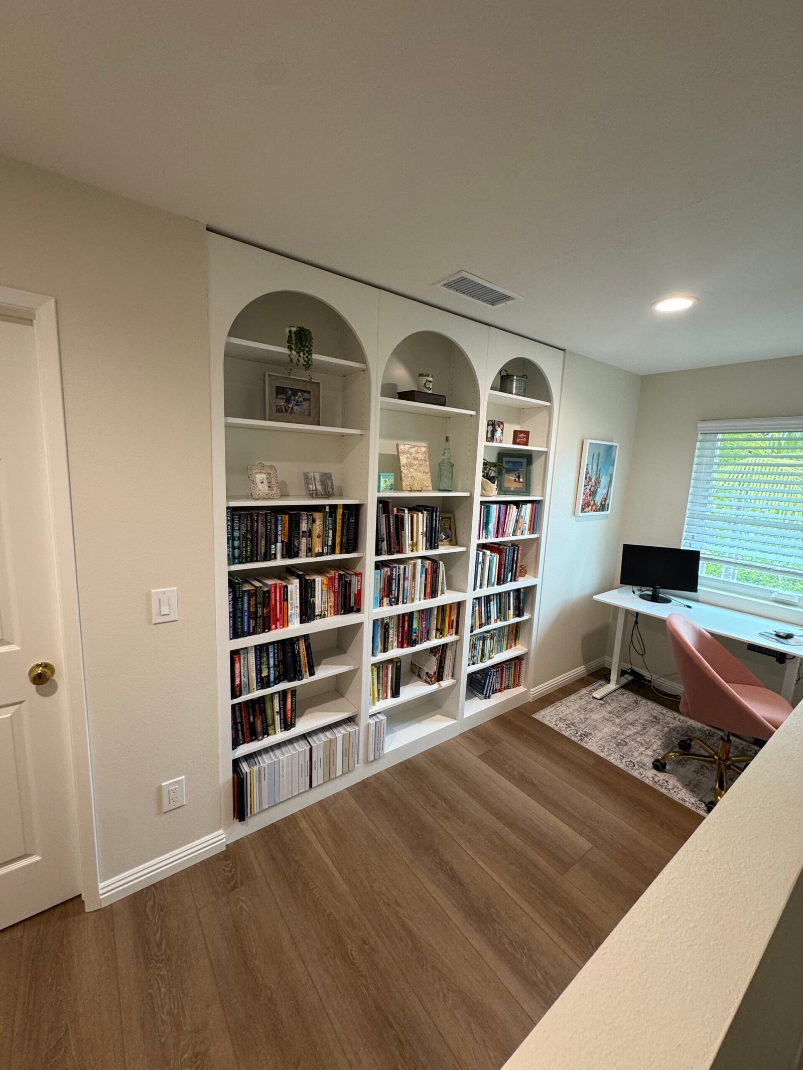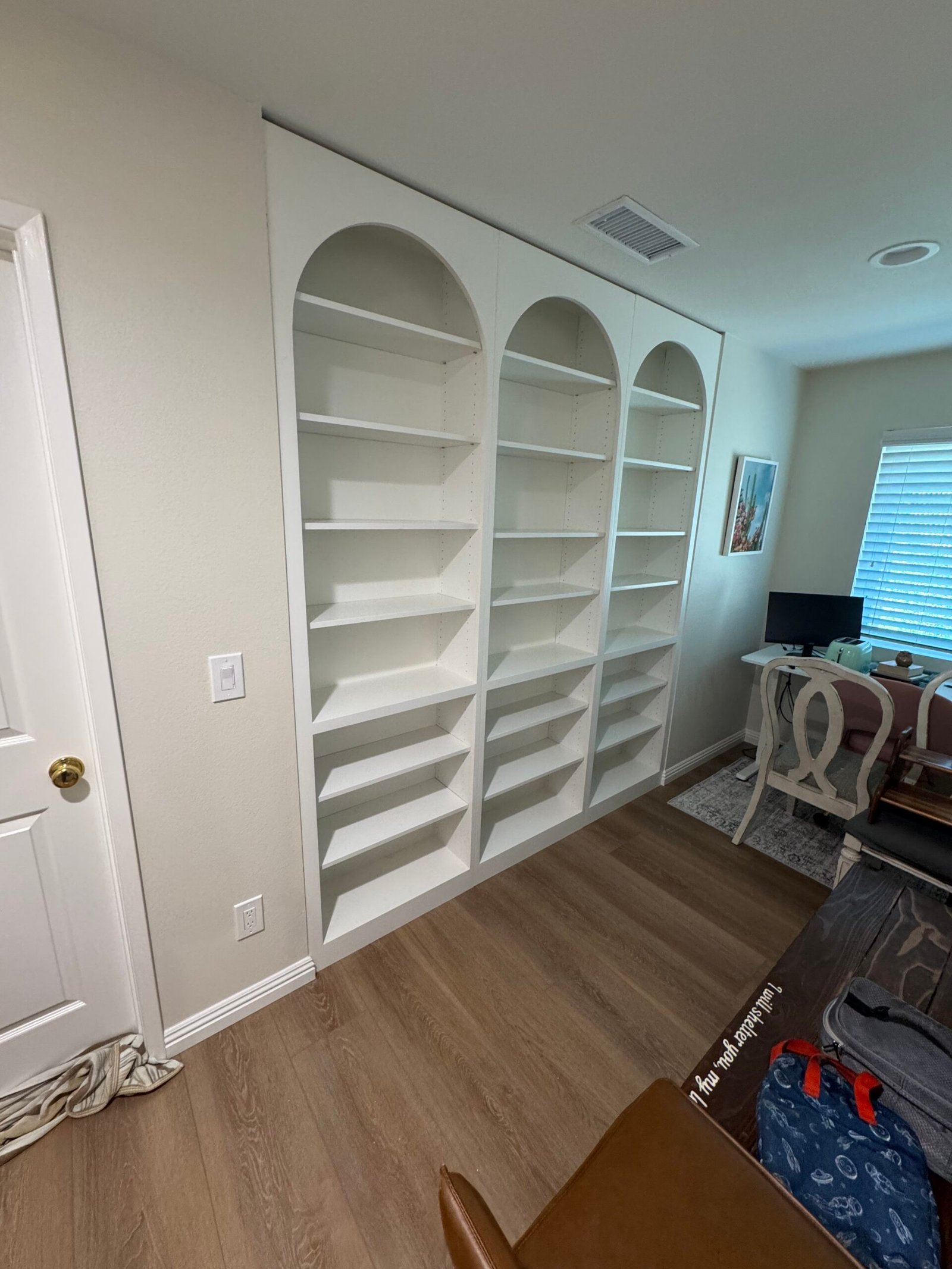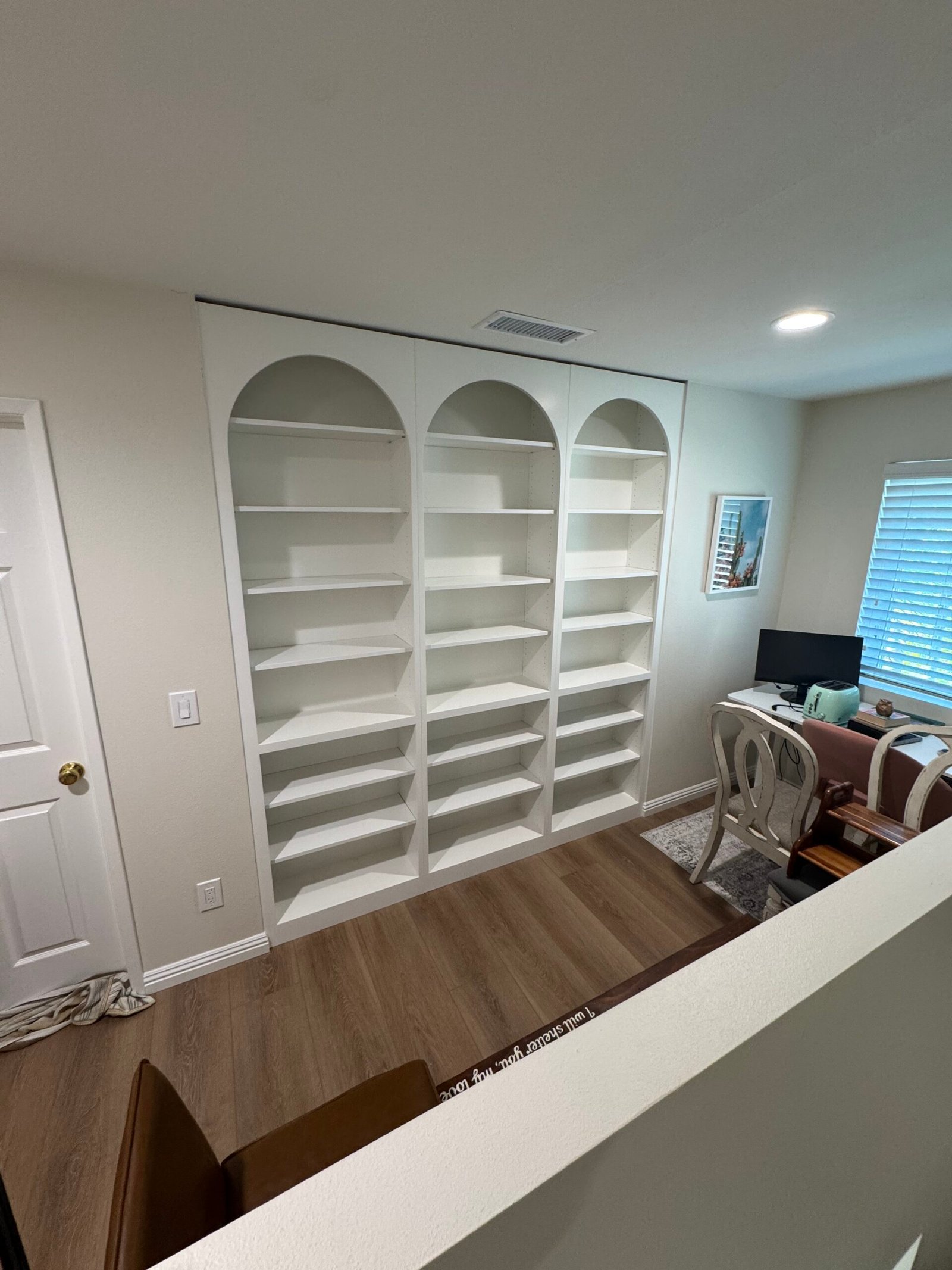 Solution: We utilized a combination of modern design software and traditional woodworking techniques to fabricate three perfect arches, ensuring the final design was both geometrically precise and visually graceful. By finishing the entire unit in a single, classic white, we allowed the beautiful architectural shape of the arches, rather than a bold color, to be the main design statement. The result is a sophisticated and wonderfully understated piece of custom millwork that adds immense character and a high-end, custom feel to the home’s study loft.