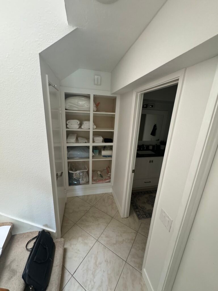 “Adding doors to our open hallway shelving was the best decision we could have made. The entire hallway looks so much cleaner and more finished now. It finally feels like a high-end built-in, and all our clutter is neatly hidden away.” – Del Mar Homeowner